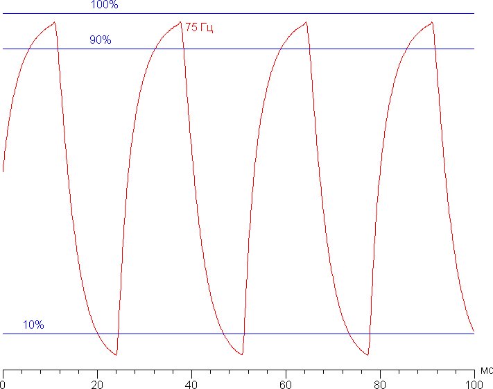 Приведем зависимость яркости (вертикальная ось) от времени (горизонтальная ось) при чередовании белого и черного кадра при 75 Гц кадровой частоты: