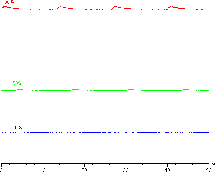 На любом уровне яркости значимая модуляция подсветки отсутствует, что исключает видимое мерцание экрана. Для тех, кто привык распознавать знакомое сокращение, уточним: ШИМ отсутствует. В доказательство приведем графики зависимости яркости (вертикальная ось) от времени (горизонтальная ось) при различных значениях настройки яркости: