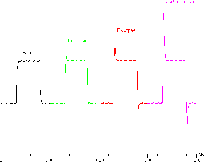 Ниже приведены графики полутонового перехода между оттенками 60% и 80% и обратно при различных значениях настройки Авто-реагирование (по вертикали — яркость, по горизонтали — время, для наглядности графики выстроены последовательно):