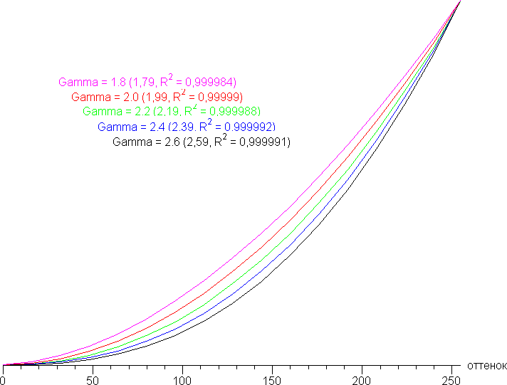 Реальная гамма-кривая зависит от выбранного профиля в списке Gamma (значения показателя аппроксимирующей функции приведены в скобках в подписях, там же — коэффициент детерминации R²):