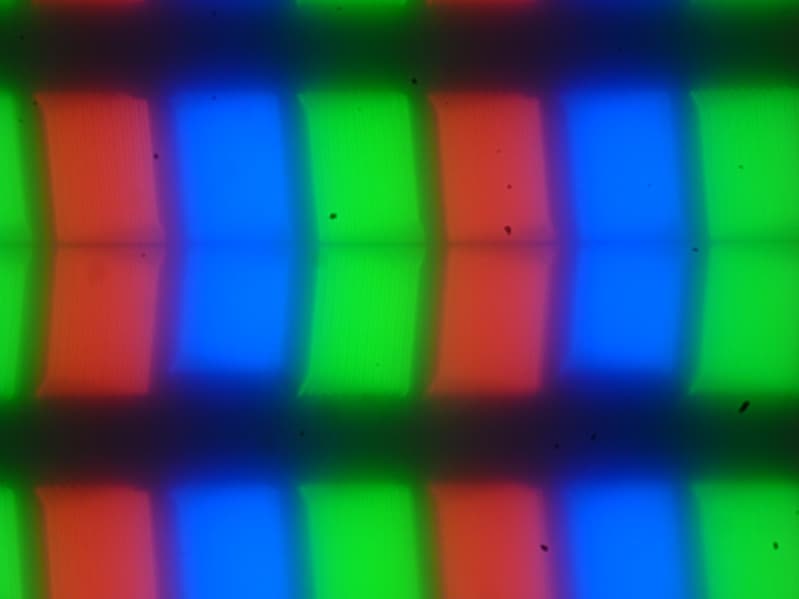 Из-за матовой поверхности экрана четкого изображения пикселей получить не удалось (черные точки — это пыль на матрице фотоаппарата), однако характерная для IPS структура субпикселей просматривается: