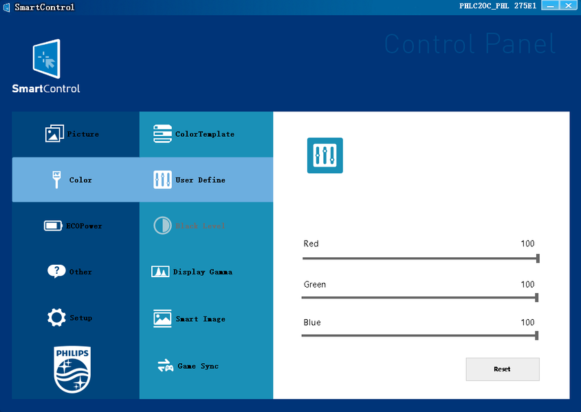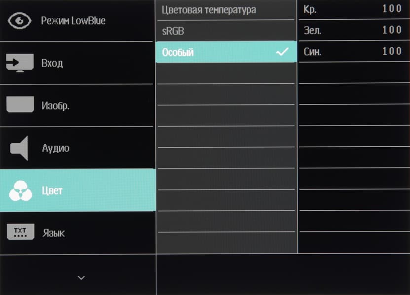 Цветовой баланс устанавливается выбором одного из предустановленных профилей с условными значениями цветовой температуры или ручной регулировкой интенсивности трех цветов после выбора профиля Особый. Также есть профиль sRGB с условной цветовой температурой 6500 К и сниженной яркостью.