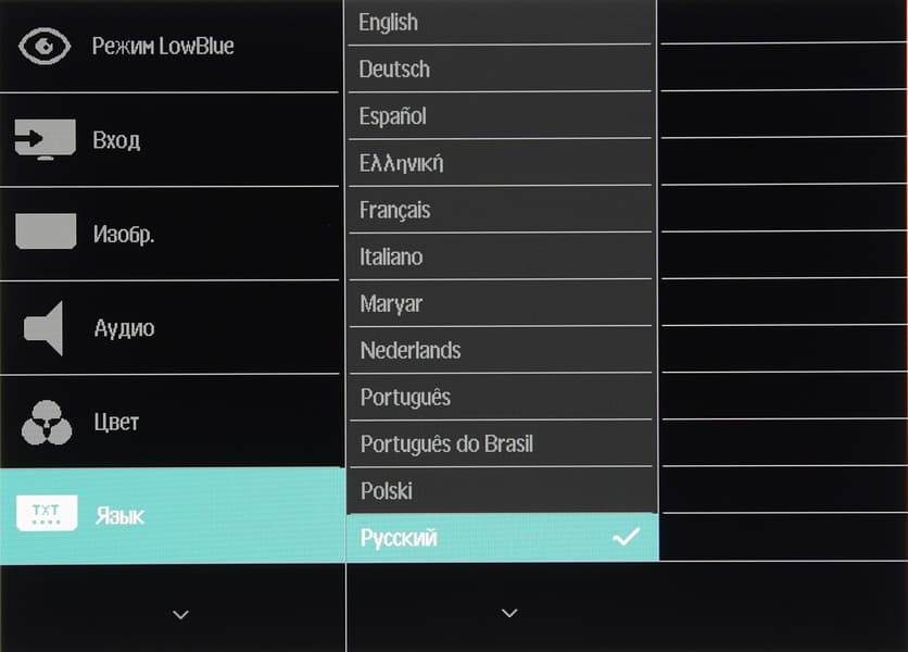 При необходимости можно поменять положение меню на экране, настроить уровень прозрачности фона и выбрать тайм-аут автоматического выхода из меню. Есть русская версия экранного меню. Кириллический шрифт меню достаточно ровный и читаемый, качество перевода на русский язык приемлемое, есть странности, но их немного.