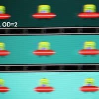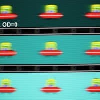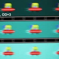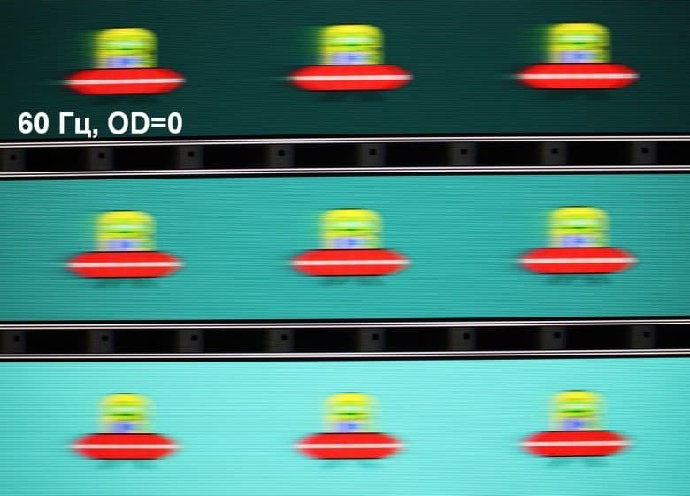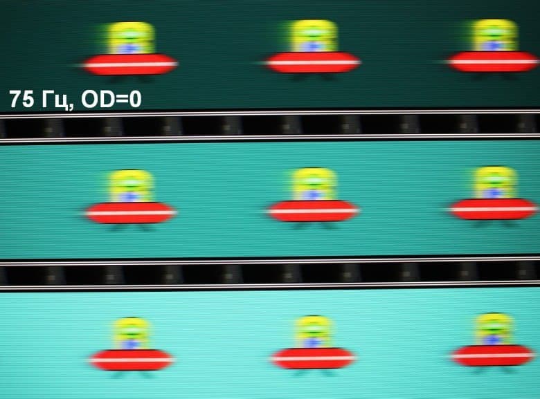 Для наглядного представления о том, что на практике означает такая скорость матрицы и какие могут быть артефакты от разгона, приведем серию снимков, полученных с помощью движущейся камеры. Такие снимки показывают, что видит человек, если он следит глазами за двигающимся на экране объектом. Описание теста приведено тут, страница с самим тестом тут. Использовались рекомендованные установки — скорость движения 960 пиксель/с для частоты 60 Гц, и 975 пиксель/с для 75 Гц. Выдержка 1/15 с, на фотографиях указаны значения частоты обновления, а также ступень разгона (OD с цифрой).