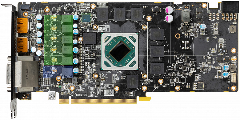 Все это установлено на прилично большом радиаторе, который охлаждает графическое ядро и силовые элементы схемы питания. Очевидно, что СО по наследству досталась от более старших решений уровня RX 580/590, поэтому для такой карты выглядит явно немного избыточной.