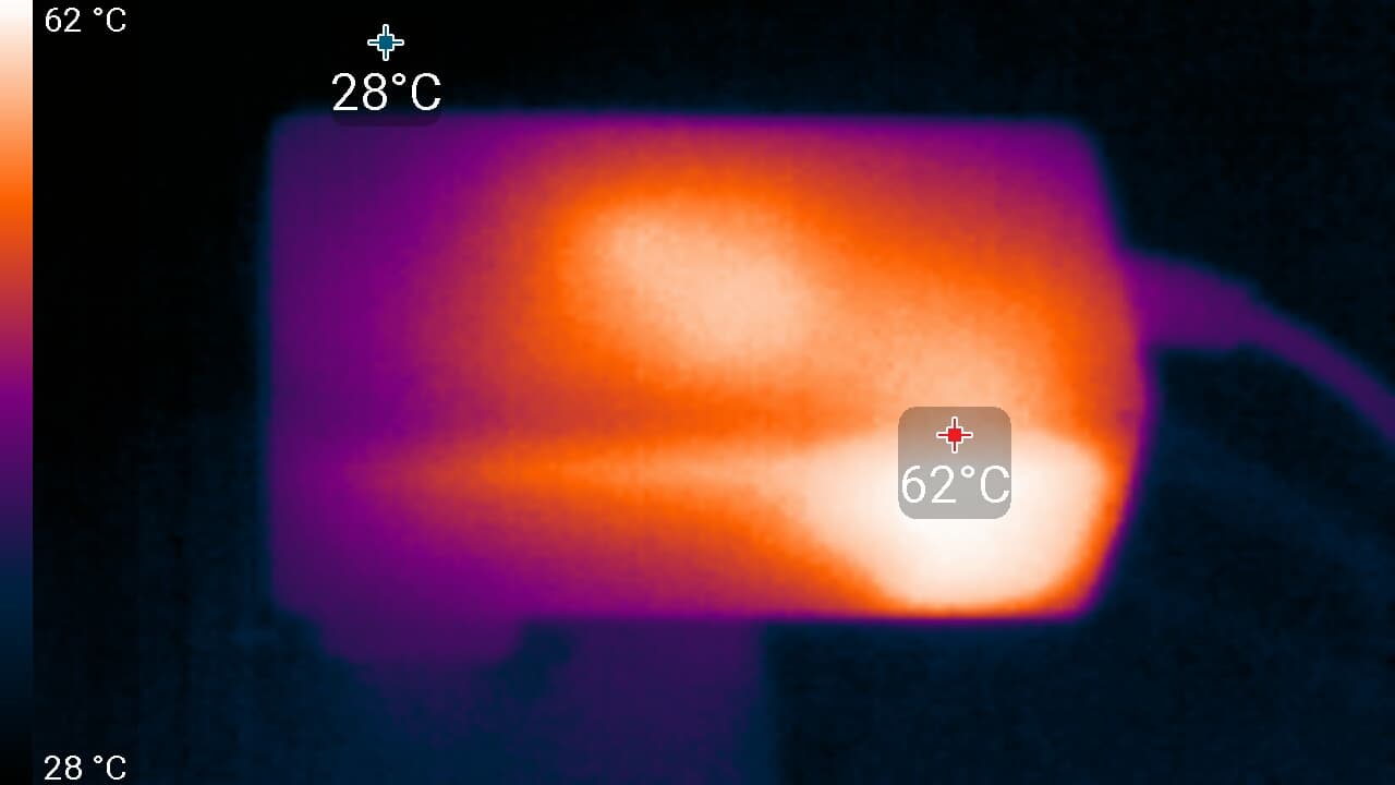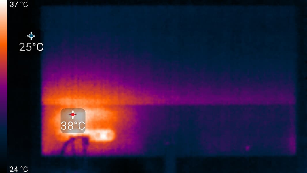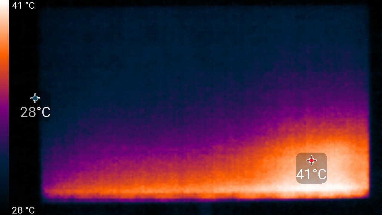 Нижний край экрана нагрелся до 44 °C максимум (это видно на снимках с более близкого расстояния). Видимо, внизу находится светодиодная линейка подсветки экрана. Нагрев сзади умеренный: