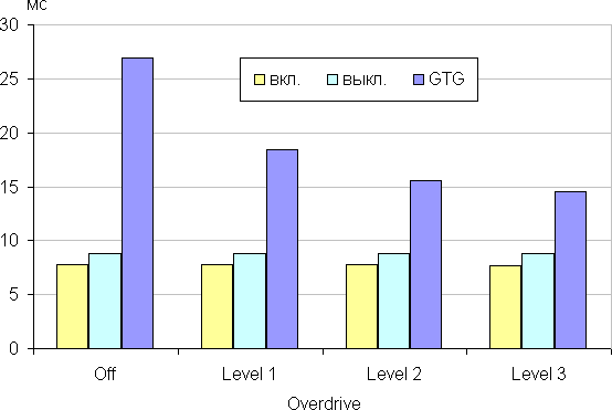 Время отклика зависит от значения настройки Overdrive, которая управляет разгоном матрицы. Диаграмма ниже показывает, как меняется время включения и выключения при переходе черный-белый-черный (столбики «вкл.» и «выкл.»), а также среднее суммарное (от первого оттенка до второго и обратно) время для переходов между полутонами (столбики «GTG»):