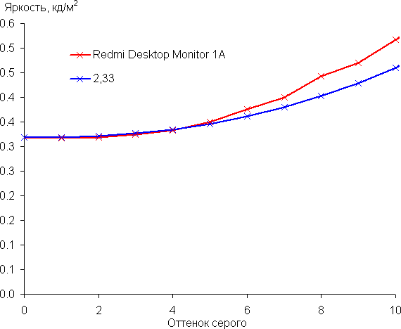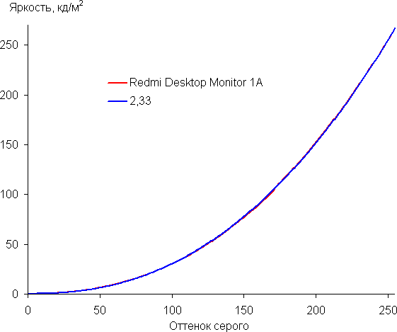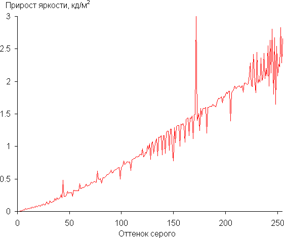 Для оценки характера роста яркости мы измерили яркость 256 оттенков серого (от 0, 0, 0 до 255, 255, 255). График ниже показывает прирост (не абсолютное значение!) яркости между соседними полутонами: