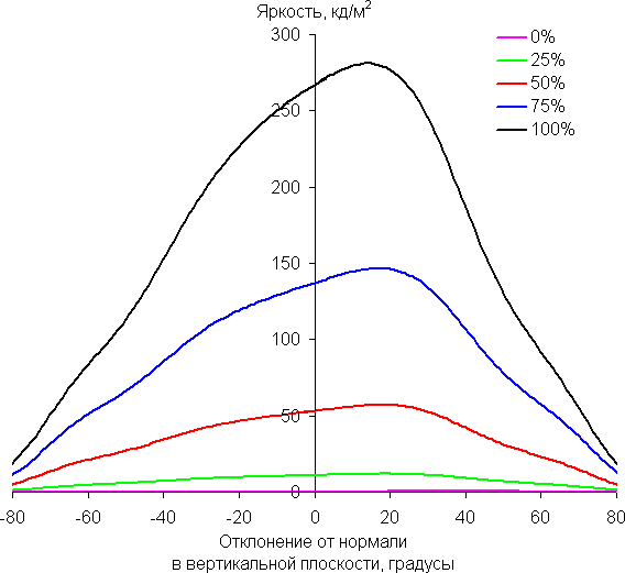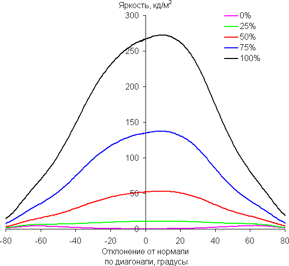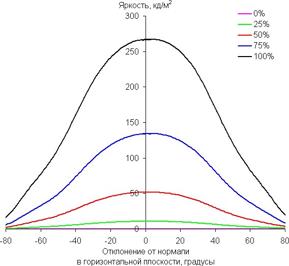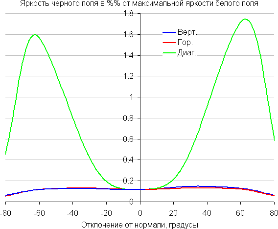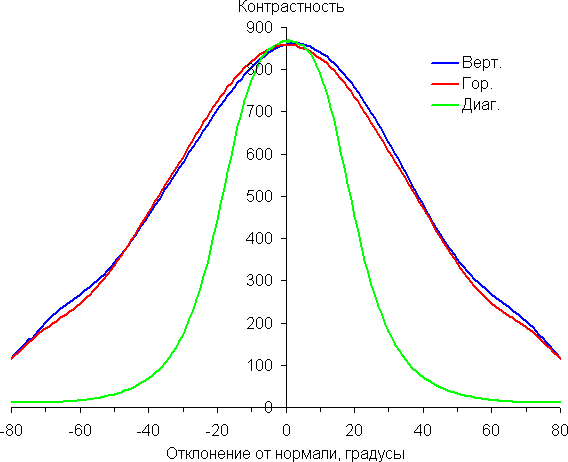 Отметим плавное уменьшение яркости при отклонении от перпендикуляра к экрану в довольно широком диапазоне углов и во всех трех направлениях, при этом графики не пересекаются во всем диапазоне измеряемых углов. При отклонении в диагональном направлении яркость черного поля начинает резко возрастать уже при 20°-30° отклонения от перпендикуляра к экрану. Если сидеть не очень далеко от экрана, то черное поле по углам будет заметно светлее, чем в центре, и иметь легкий фиолетовый оттенок. Контрастность в диапазоне углов ±82° в случае отклонения по диагонали вплотную приближается к отметке 10:1, но все же не опускается ниже.