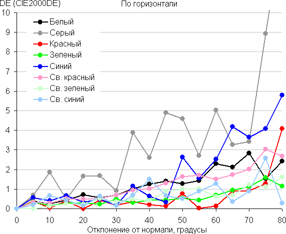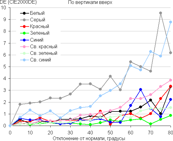 Для количественной характеристики изменения цветопередачи мы провели колориметрические измерения для белого, серого (127, 127, 127), красного, зеленого и синего, а также светло-красного, светло-зеленого и светло-синего полей во весь экран с использованием установки, подобной той, что применялась в предыдущем тесте. Измерения проводились в диапазоне углов от 0° (датчик направлен перпендикулярно к экрану) до 80° с шагом в 5°. Полученные значения интенсивностей были пересчитаны в ΔE относительно замера каждого поля при перпендикулярном положении датчика относительно экрана. Результаты представлены ниже: