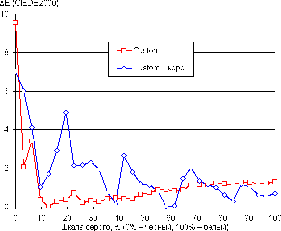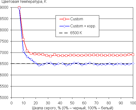 Цветовой баланс просто при выборе профиля Custom для цветовой температуры очень хороший, так как цветовая температура несильно выше стандартных 6500 К, и отклонение от спектра абсолютно черного тела (ΔE) ниже 2, что даже для профессионального устройства считается отличным показателем. При этом цветовая температура и ΔE мало изменяются от оттенка к оттенку — это положительно сказывается на визуальной оценке цветового баланса. (Самый близкий к черному диапазон можно не учитывать, так как в нем цветопередача не так важна, а погрешность измерения цветовых характеристик высокая.) Но мы все равно попытались улучшить цветовой баланс, регулируя усиление трех основных цветов. Графики ниже показывают цветовую температуру на различных участках шкалы серого и отклонение от спектра абсолютно черного тела (параметр ΔE) в случае профиля Custom без коррекции и после ручной коррекции (R = 100, G = 98, B = 96):