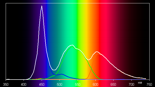 Такой спектр с узким пиком синего и с широкими горбами зеленого и красного цветов характерен для телевизоров/мониторов, в которых используется белая светодиодная подсветка с синим излучателем и желтым люминофором.