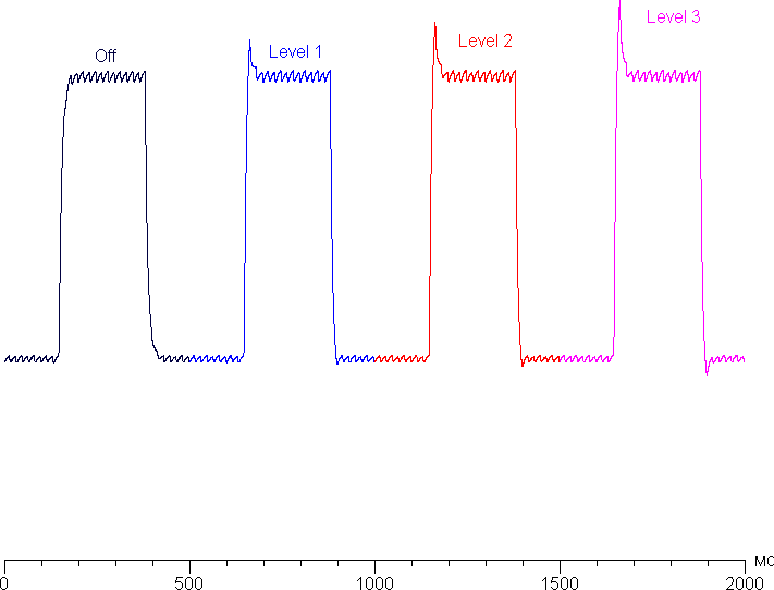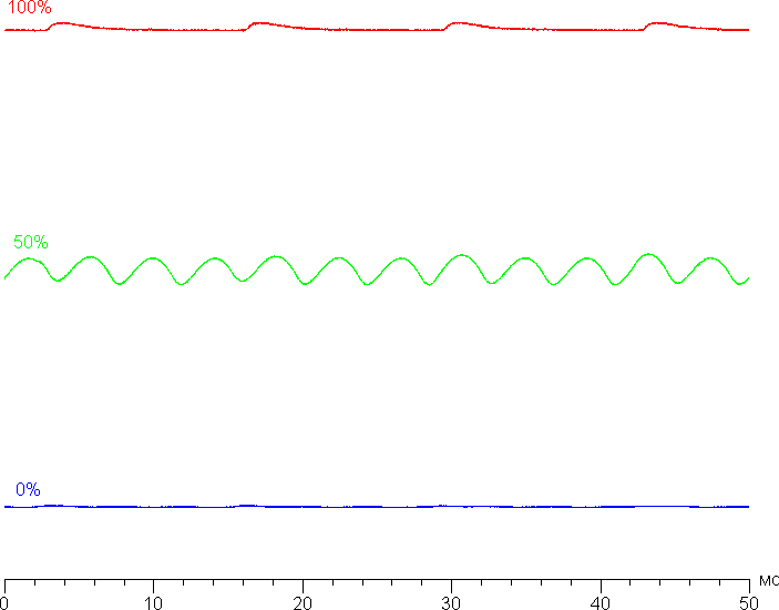 Яркость монитора меняется именно яркостью подсветки, то есть без ущерба для качества изображения (сохраняется контрастность и количество различимых градаций) яркость монитора можно менять в широких пределах, что позволяет с комфортом работать, играть и смотреть фильмы как в освещенном, так и в темном помещении. На любом уровне яркости значимая модуляция подсветки отсутствует, что исключает видимое мерцание экрана. Для тех, кто привык распознавать знакомое сокращение, повторим: ШИМ отсутствует. В доказательство приведем графики зависимости яркости (вертикальная ось) от времени (горизонтальная ось) при различных значениях настройки яркости: