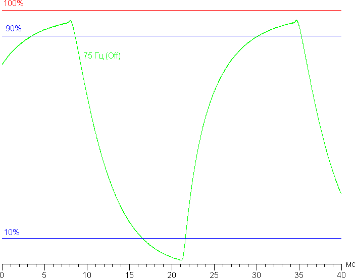 Визуально артефакты не видно даже в случае максимального разгона. С нашей точки зрения, на последнем уровне разгона скорости матрицы достаточно для динамичных игр. Приведем зависимость яркости (вертикальная ось) от времени (горизонтальная ось) при чередовании белого и черного кадра при 75 Гц кадровой частоты в случае Overdrive = Off: