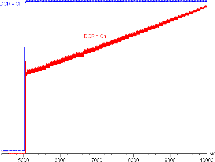 При включении режима DCR установившаяся контрастность формально возрастает до бесконечности, так как на черном поле во весь экран яркость подсветки медленно снижается, и через примерно 4,5 с она выключается совсем (но белого курсора мыши достаточно для включения подсветки). В принципе, динамическая подстройка яркости может улучшить восприятие темных сцен, но в данном случае скорость изменения яркости подсветки невысокая, поэтому практической пользы от этой функции немного. График ниже показывает, как увеличивается яркость (вертикальная ось) при переключении с черного поля во весь экран (после 5 секунд выдержки) на белое поле во весь экран при выключенной и включенной динамической подстройки яркости:
