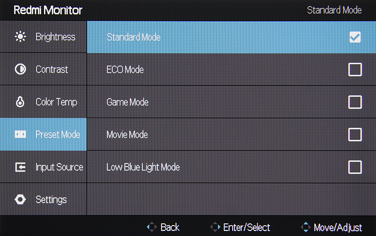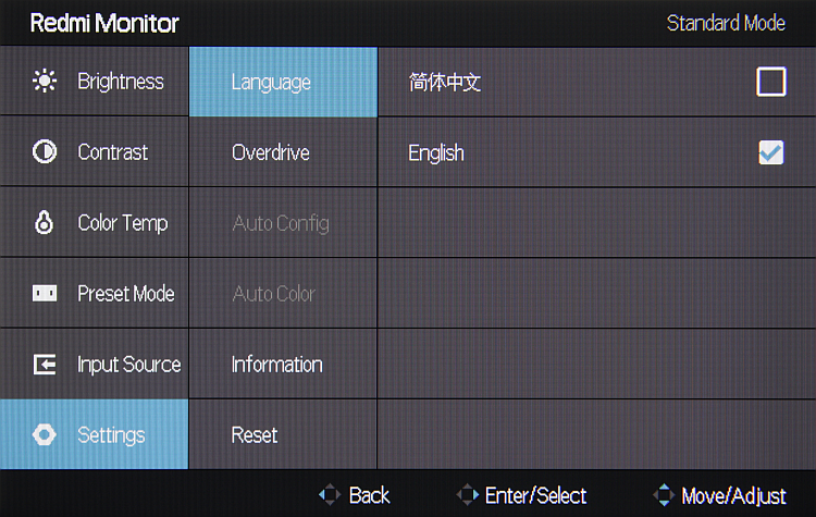 Индикатор состояния при работе неярко светится белым, редко мигает белым в режиме ожидания и не горит, если монитор условно выключен. Когда на экране нет меню, то отклонение джойстика выводит меню, а длительное нажатие выключает монитор. Короткое нажатие — включает. Меню занимает на экране значительную площадь, что иногда мешает оценке вносимых изменений. Надписи в меню достаточно крупные и читаемые. Благодаря логике переходов и джойстику, с которого не нужно снимать палец, навигация по меню очень удобная и быстрая. В текущем сеансе работы запоминается позиция первого уровня меню. Изначально меню на китайском, но достаточно просто его переключить на английский язык.