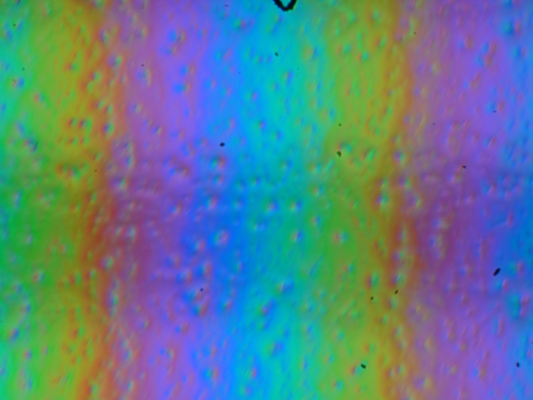 Зерно этих дефектов в несколько раз меньше размеров субпикселей (масштаб этих двух фотографий одинаковый), поэтому фокусировка на микродефектах и «перескок» фокуса по субпикселям при изменении угла зрения выражены слабо, из-за этого нет и «кристаллического» эффекта.