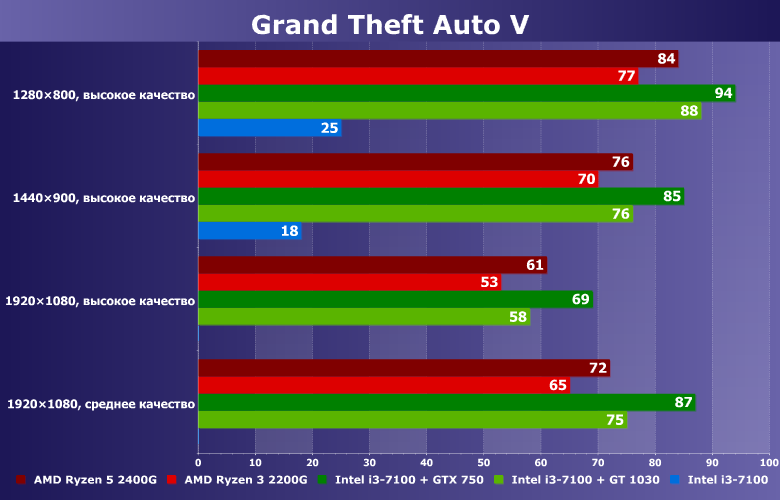 Связки Intel Core i3-7100 + GTX 750/GT 1030 выдают чуть более высокую производительность, чем AMD Ryzen 2400G/2200G, но снова стоит отметить, что платформа AMD Ryzen 5 2400G заметно дешевле, чем Intel Core i3-7100 + GTX 750, и этот факт перевешивает разницу в производительности. Таким образом, платформа AMD Ryzen 5 2400G — очень привлекательный вариант для игры Grand Theft Auto V. Традиционно также надо подчеркнуть, что платформа AMD не требует установки дополнительной видеокарты с лишним источником шума в виде кулера.