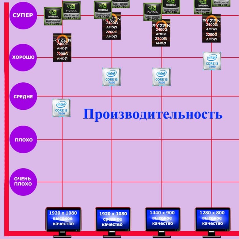 - Разрешение 1920×1080 на средних настройках качества: все системы (кроме Intel Core i3-7100) обеспечивают уже просто космическую играбельность, а встроенная графика Intel — хорошую.