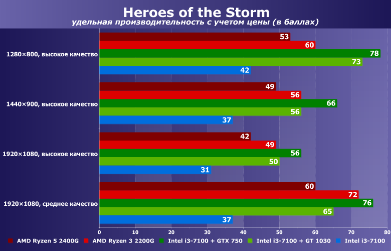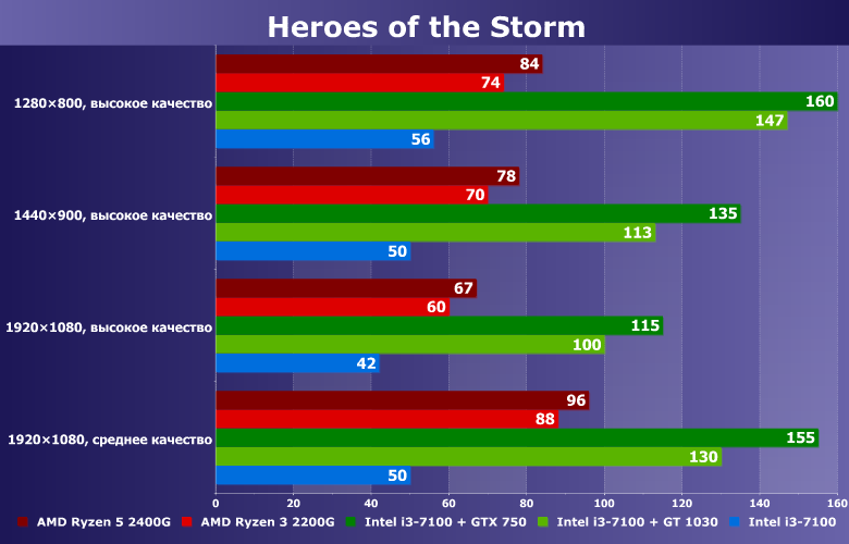 Heroes of the Storm отлично подходит для ПК начального уровня при игре на высоких настройках качества во всех разрешениях, включая 1920×1080, и только в случае интегрированной графики Intel Core i3-7100 лучше понизить разрешение, сохранив высокие настройки графики. Как уже говорилось ранее, оценка «супер» в этой игре легко достижима для обоих «дуэтов» Intel+Nvidia, да и платформы AMD вполне вытягивают «супер».