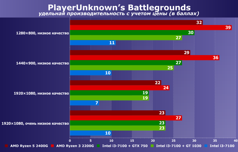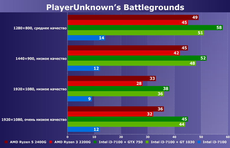 Игра PlayerUnknown’s Battlegrounds подходит для ПК начального уровня... не очень хорошо. И только при низких настройках качества. Причем разрешение 1920×1080 с точки зрения играбельности лучше использовать при очень низких настройках качества (связки Intel+Nvidia сильнее других реагируют на снижение настроек). Платформы AMD при этом балансируют на минимуме играбельности, а про очень медленную интегрированную графику Intel лучше промолчать. А вот если выбрать низкие настройки качества в разрешениях ниже Full HD, то все конфигурации (кроме Core i3) начинают показывать приемлемые результаты. В целом, в «дуэтах» с GeForce GT 1030 и GTX 750 платформа Intel Core i3-7100 в очередной раз быстрее решений AMD. Однако радикального превосходства эти варианты не имеют, и можно сказать, что платформы AMD Ryzen демонстрируют достаточную скорость.