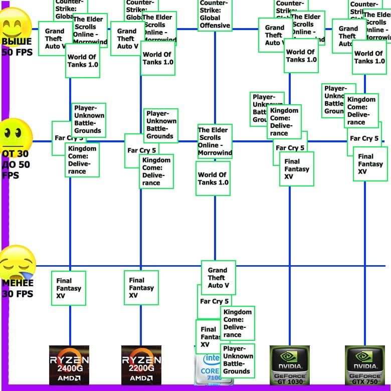 | AMD Ryzen 3 2200G | AMD Ryzen 5 2400G | Intel Core i3-7100 | Intel Core i3-7100+GT 1030 | Intel Core i3-7100+GTX 750 |