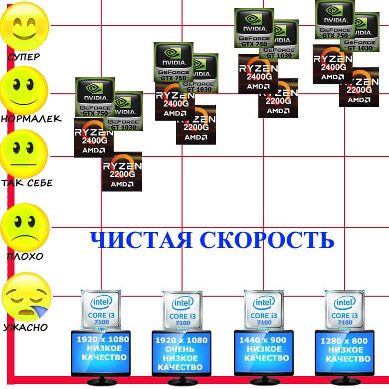 - Разрешение 1440×900 на низких настройках качества: на всех конфигурациях (кроме Intel Core i3-7100) можно приемлемо играть.