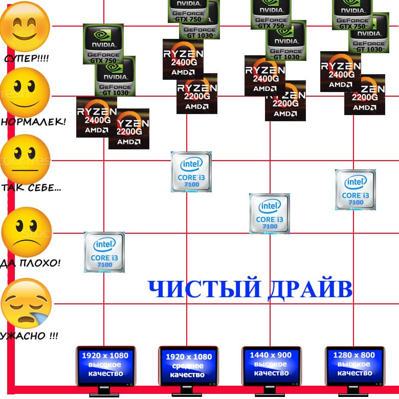 - Разрешение 1280×800 на высоких настройках качества: все «дуэты» и платформы AMD «рулят», Intel + Nvidia GT1030/GTX 750 даже выдают «суперские супер», и только Intel Core i3-7100 выдает лишь условно приемлемый результат.