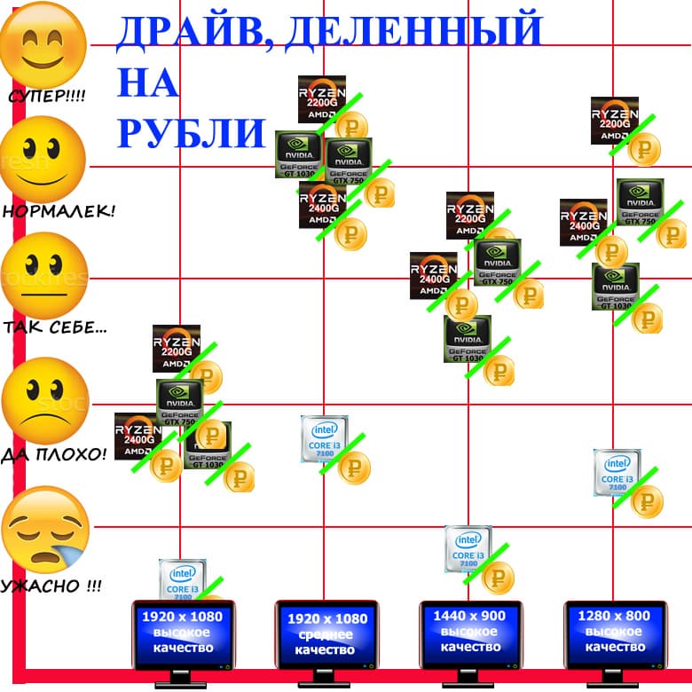 Но из статьи в статью мы не делаем выводов лишь по «чистому драйву», потому что ПК не падают с небес. За них надо платить — и за компы для простых домашних дел или гуляния по интернету, и за офисные системники, которые стоят сейчас не так уж мало. Поэтому чистый драйв надо поделить на деньги, затраченные на тот или иной конфиг. И что мы видим?
