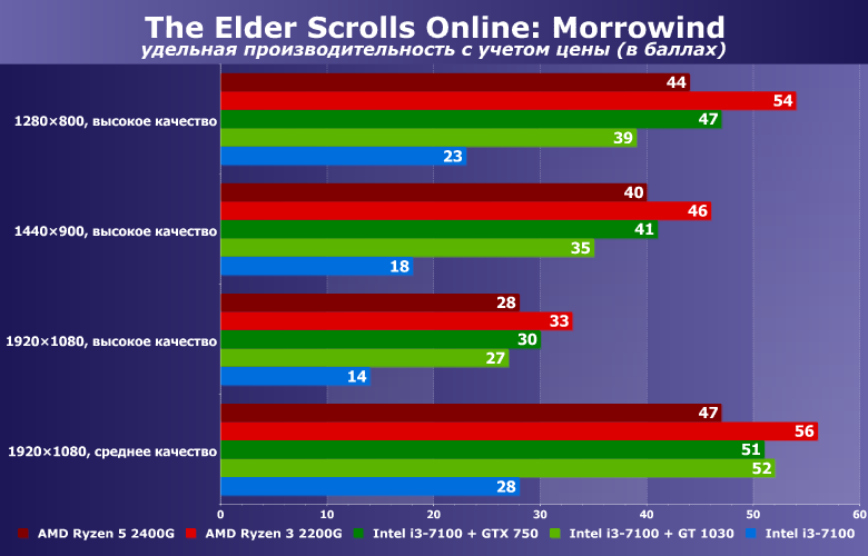 Еще раз стоит повторить: связки Intel Core i3-7100 + GTX 750/GT 1030 выдают более высокую производительность, нежели их соперники в лице AMD Ryzen 3/5 2200G/2400G, и даже низкая стоимость платформ AMD подчас не компенсирует этот перевес. Впрочем, вариант AMD Ryzen 3 2200G все же оказался самым выгодным для игры в The Elder Scrolls Online: Morrowind из протестированных (снова напомним, что платформы AMD не требуют установки дополнительной видеокарты с лишним источником шума в виде кулера). Всякую лабуду про легкость апгрейдов в том или ином случае обсуждать не вижу смысла: каждый пионер сам решает, как и где апгрейдить свой галстук. Кто-то считает, что проще в случае AMD: купил новый «камень с вегой внутри» — и всего делов. Тот же сокет, та же «мамка». А кто-то полагает, что интереснее прикупить новую видеокарту GeForce и поставить в ту же платформу Intel.