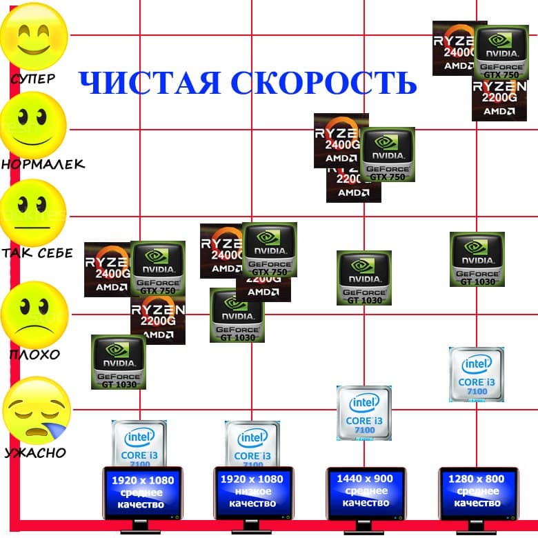 | AMD Ryzen 3 2200G | AMD Ryzen 5 2400G | Intel Core i3-7100 | Intel Core i3-7100+GT 1030 | Intel Core i3-7100+GTX 750 |