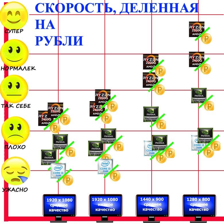 Еще раз следует отметить: на рынке появились достаточно мощные и экономически выгодные AMD Ryzen со встроенной графикой, успешно конкурирующей с самыми современными дискретными ускорителями бюджетного уровня (к сожалению, Intel все еще «спит», и его встроенная графика — ниже плинтуса, а жаль). Так что приобретать дискретные видеокарты бюджетного сегмента практически не имеет смысла.