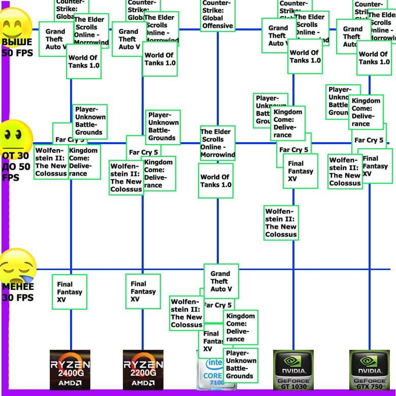 Судя по результатам ранее протестированных «в новом цикле» игр, платформа AMD Ryzen 5 2400G смотрится весьма неплохо (хотя в большинстве игр по чистой скорости побеждают связки Intel+Nvidia), и в целом ее покупать выгоднее, чем систему с дискретной графикой уровня GTX 750. А платформа AMD Ryzen 3 2200G по результатам тестирования в 9 играх является самым выгодным приобретением, поэтому не имеет смысла обращать внимание на связки типа Intel Core i3+7100 + GT 1030, которые являются ее конкурентами по стоимости.