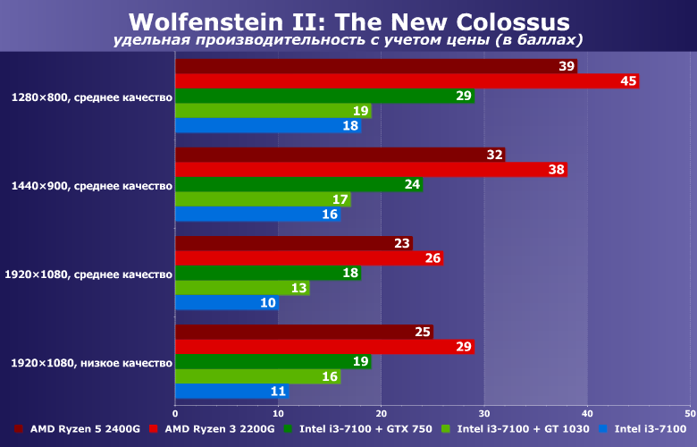 Результаты «чистой» платформы Intel Core i3-7100 без внешней графики нет смысла обсуждать: всего в паре игр мы получили более-менее сносную производительность (но не в Wolfenstein II: The New Colossus).