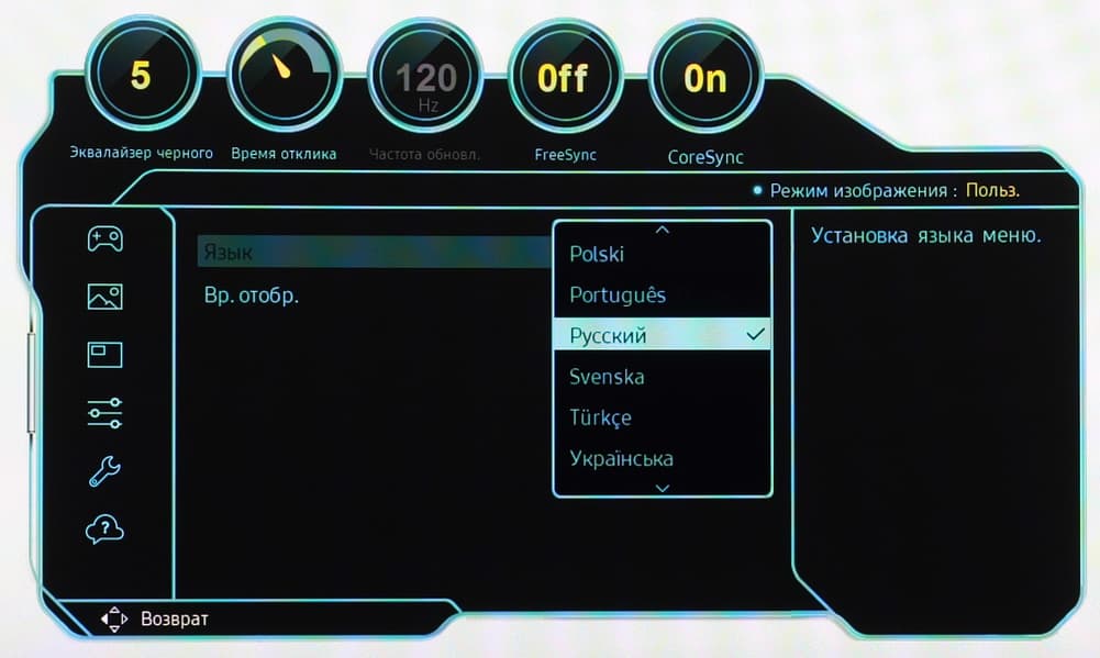 Навигация удобная, к тому же списки зациклены. При настройке изображения основное меню убирается с экране, остается только ползунок с настройкой, или короткий список с ползунками, или список с вариантами значения настройки. Это облегчает оценку вносимых изменений. Можно выбрать задержку автоматического выхода из меню. Присутствует русская версия экранного меню.