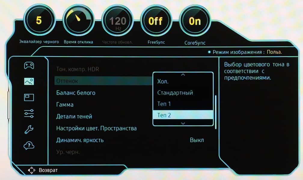 При этом не меняются уровни черного и белого (за исключением изменения яркости из-за прогрева монитора), что очень хорошо. Обе настройки работают совершенно одинаково.