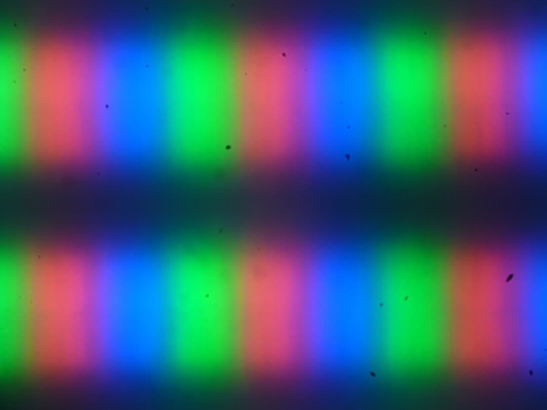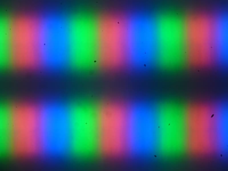 Четкое изображение структуры пикселей из-за матовой поверхности получить не удается, впрочем, при желании на фрагменте ниже можно разглядеть типичную для VA структуру в виде параллельных полосок. Субпиксели трех цветов (красного, зеленого и синего) разделены на четыре участка с доменами в различающейся ориентации. Такое устройство в принципе способно обеспечить хорошие углы обзора, чему способствует вариация ориентации ЖК в доменах (черные точки — это пыль на матрице фотоаппарата):