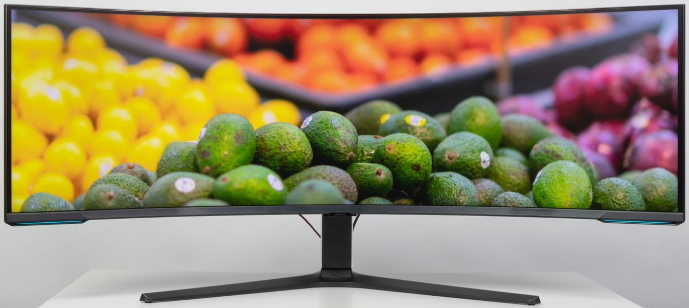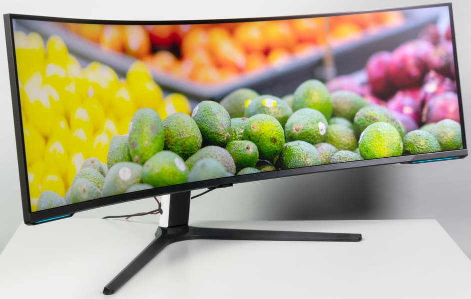Samsung 57″ Odyssey Neo G9 — это игровой монитор высшего класса. К его особенностям относятся огромный и очень широкий, изогнутый с радиусом всего 1 м экран с очень высоким разрешением. Есть поддержка частоты обновления до 240 Гц включительно, AMD FreeSync и Nvidia G-Sync Compatible. Всё это выводит степень погружения в игровой процесс на новый уровень. Остается только найти ту видеокарту, которая в современных играх позволит полностью реализовать возможности этого монструозного монитора. Впрочем, несмотря на явную ориентацию на геймеров, монитор можно использовать для выполнения офисной работы и для просмотра кино, а также для работы с большим количеством информации и в системах CAD/CAM. Неширокие углы обзора как по снижению яркости, так и по изменению цветов частично компенсируются тем, что экран изогнутый, но сидеть за монитором лучше строго в оптимальной точке.