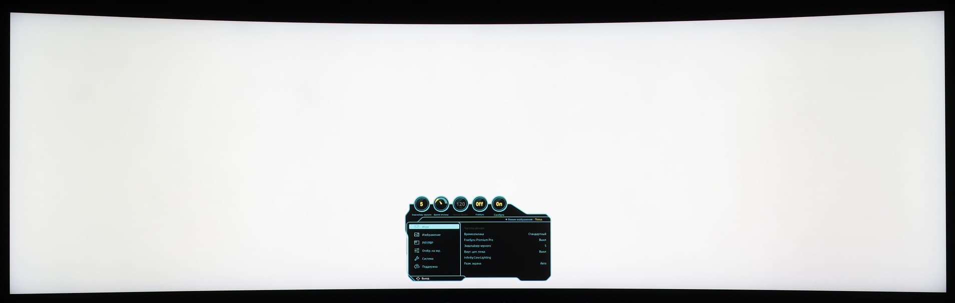 Высветление к краям отчасти обусловлено тем, что экран изогнут и его края относительно фотоаппарата находятся под большим углом. Характер засвеченных участков позволяет предположить, что появились они в основном из-за деформации матрицы в результате ее изгиба. Заметим, что достаточно высокая контрастность снижает видимость неравномерности черного поля: ее видно только в темноте при выводе черного на весь экран и после того, как глаза немного адаптируются к темноте. Также неравномерность сильнее видна при взгляде под большим углом к экрану.