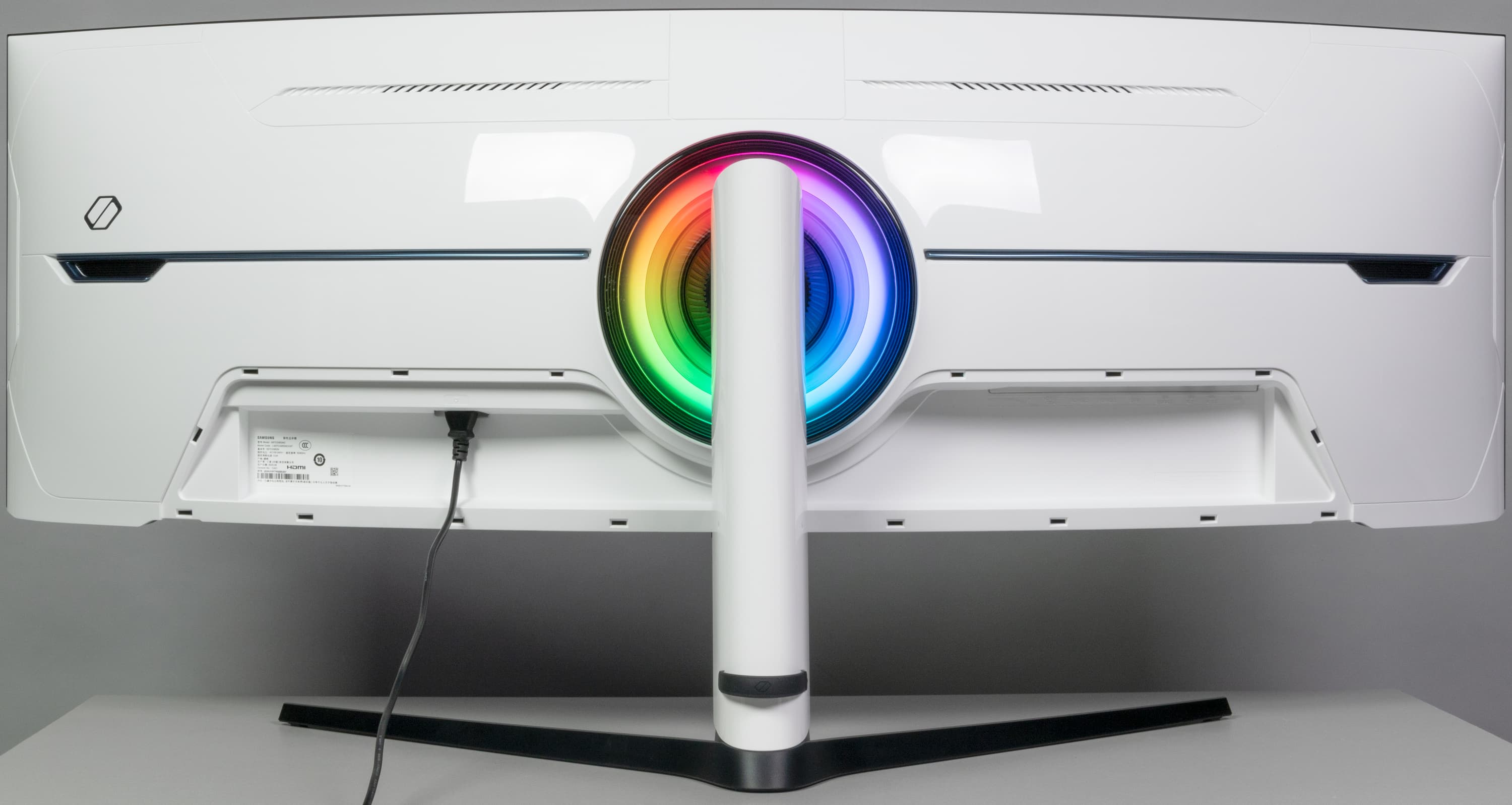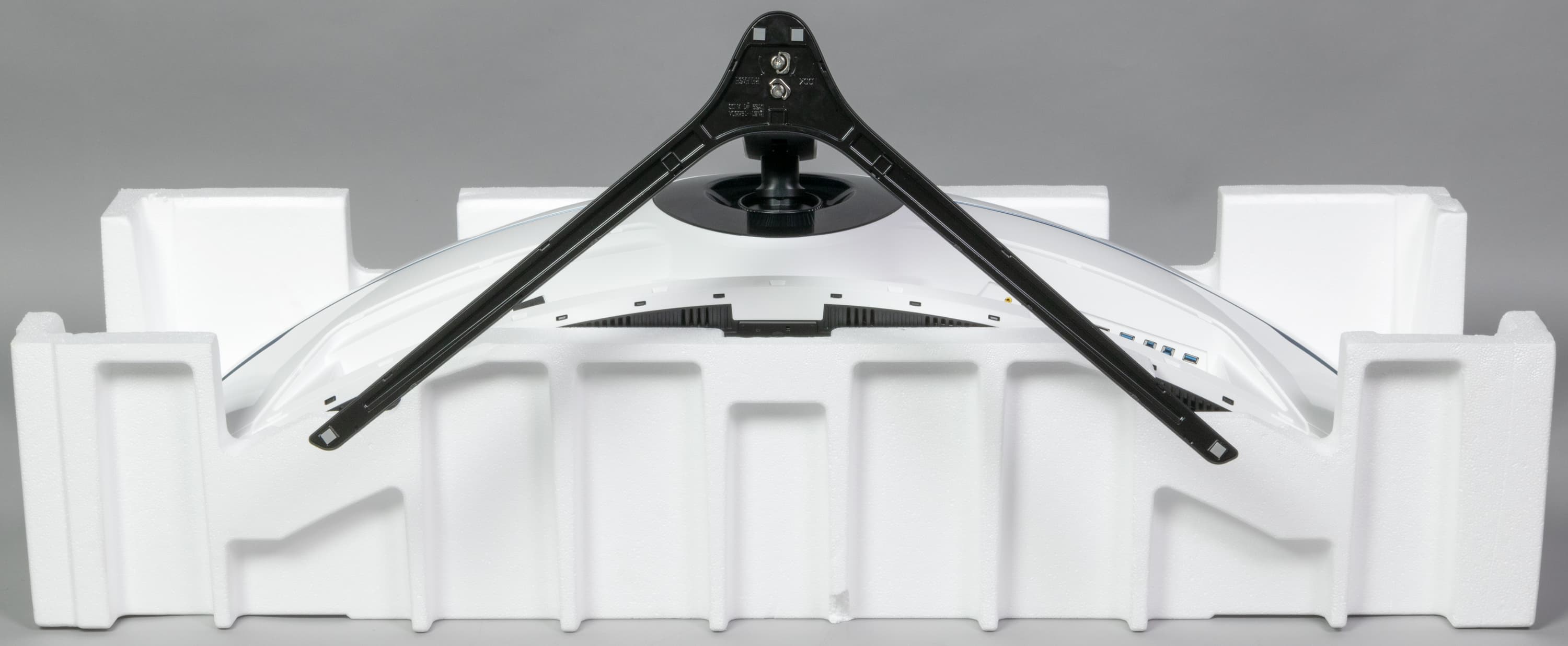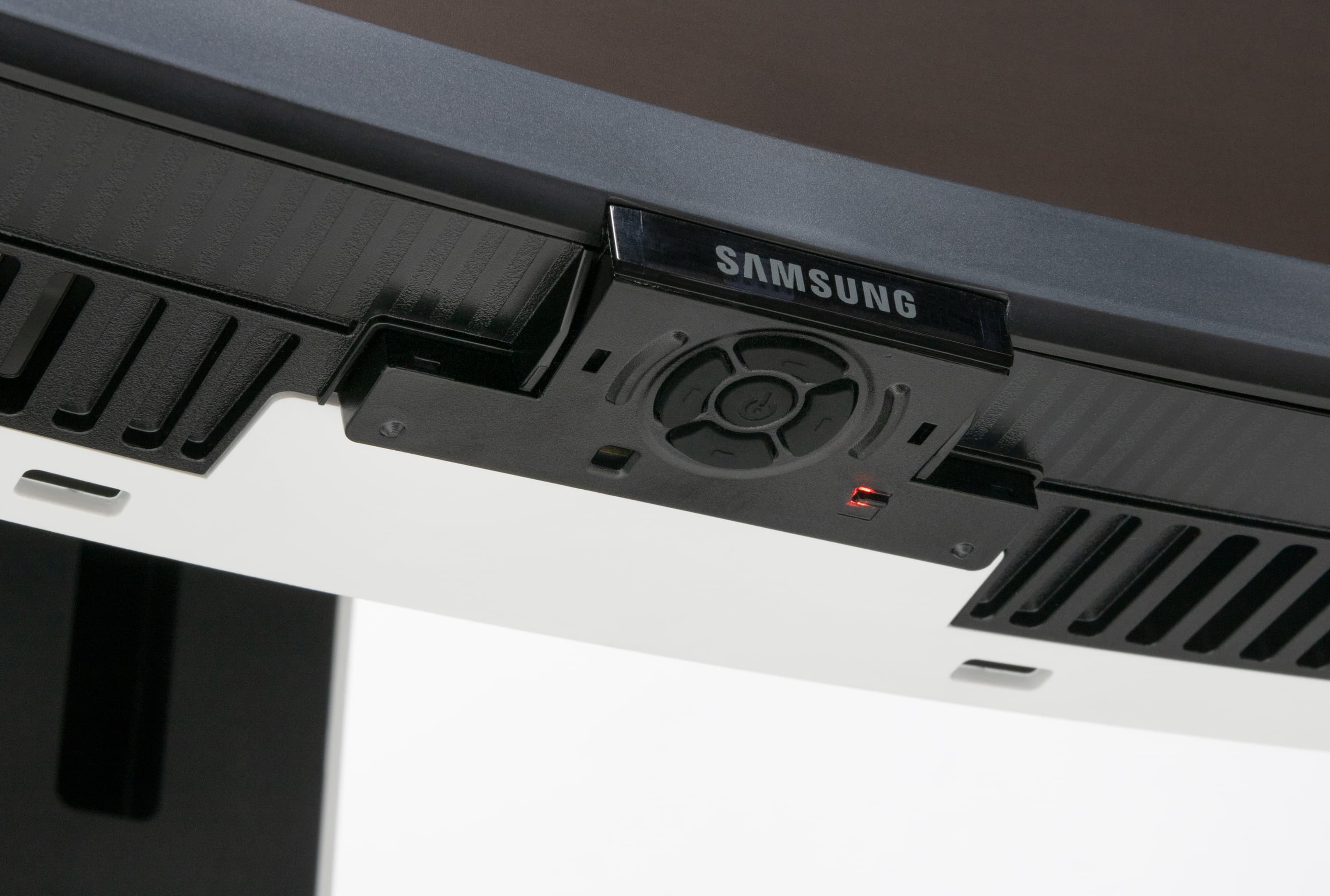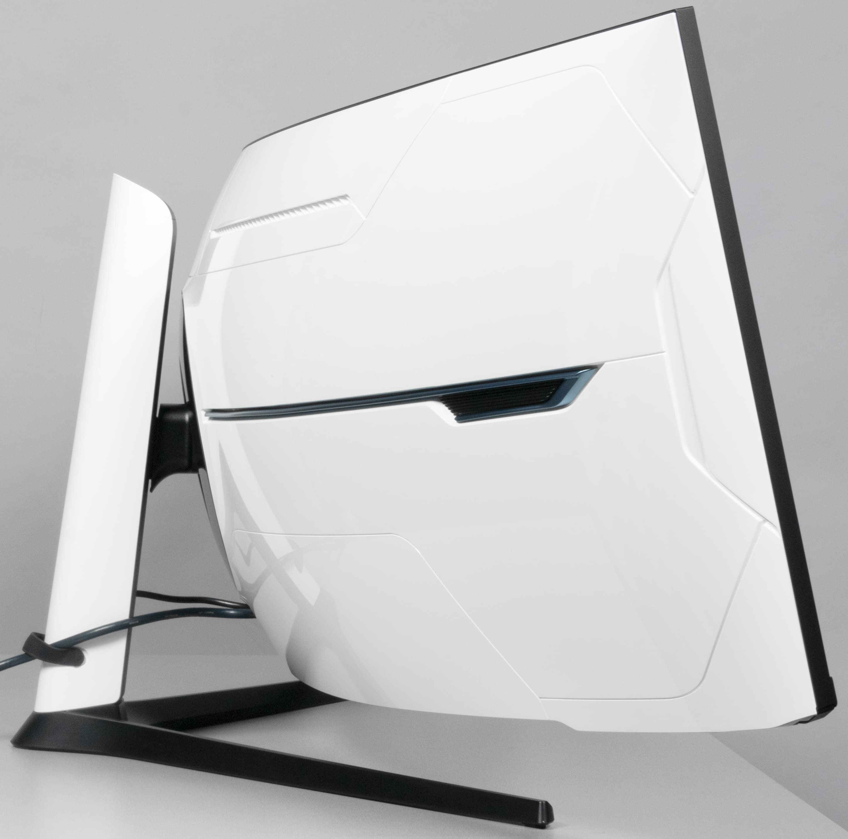 Дизайн весьма строгий. Панели блока экрана и кожухи подставки изготовлены из черного пластика с матовой поверхностью и из белого пластика в основном с глянцевой поверхностью. Внешняя поверхность матрицы черная, полуматовая (зеркальность выражена не очень сильно), внешний слой матрицы жесткий. Специального антибликового покрытия (фильтра) нет. Плоскость экрана изогнута по цилиндру так, что правый и левый край немного выдвинуты вперед. Заявленный радиус изгиба равен 1 м. Равномерность кривизны экрана у данной модели хорошая, правда в вертикальной полосе шириной порядка 10 см у правого и левого края экран практически плоский, но это характерно для всех изогнутых ЖК-экранов. Спереди экран выглядит как монолитная поверхность, ограниченная снизу неширокой планкой, а по сверху и по бокам — узкой окантовкой, которая изготовлена из алюминиевого сплава с анодированной и покрашенной в черный цвет поверхностью. Выведя изображение на экран, можно увидеть, что на самом деле между внешними границами экрана и собственно областью отображения есть неширокие поля.