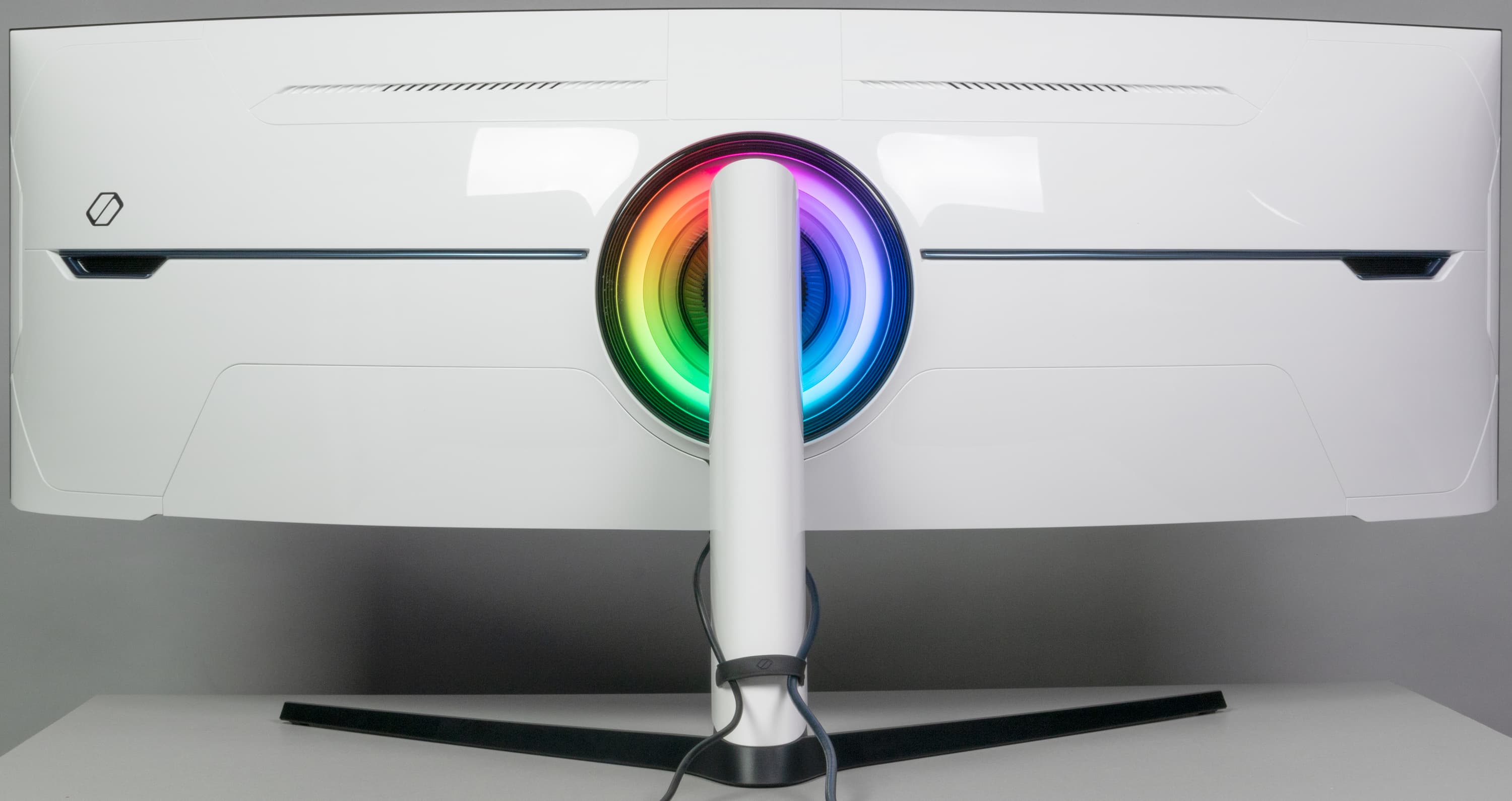 Кабели, идущие от разъемов монитора, можно пропустить через силиконовый хлястик на стойке подставки, а нишу с разъемами закрыть декоративным щитком — так сзади монитор выглядит аккуратнее.