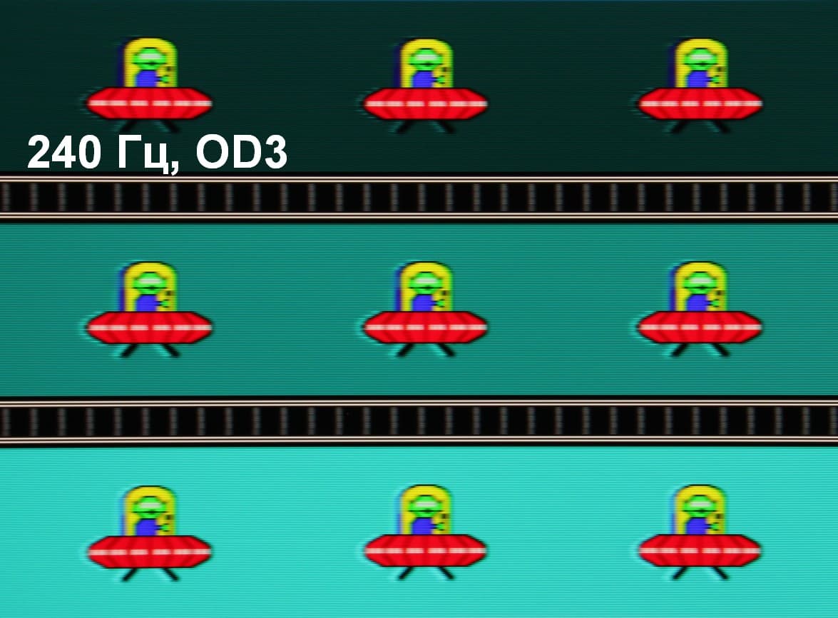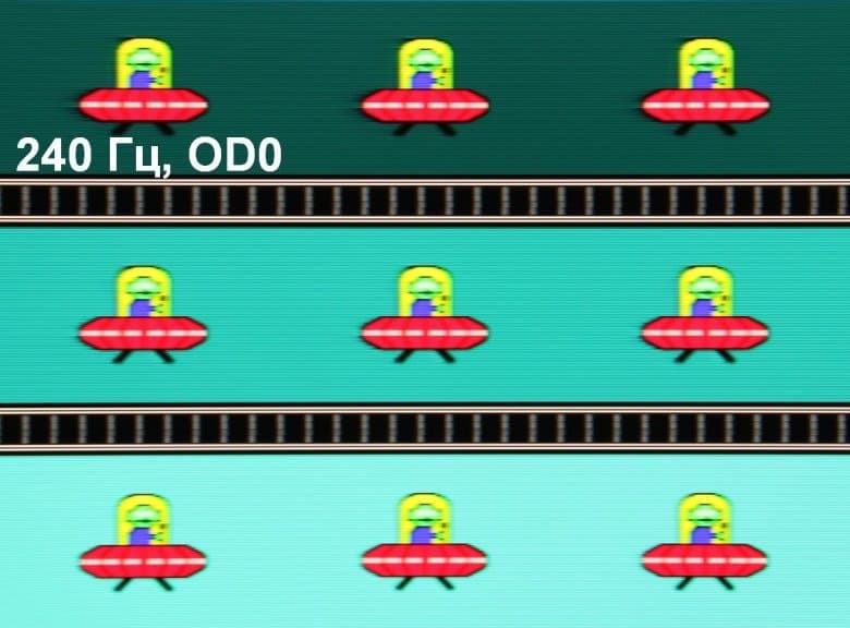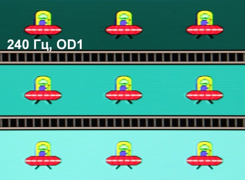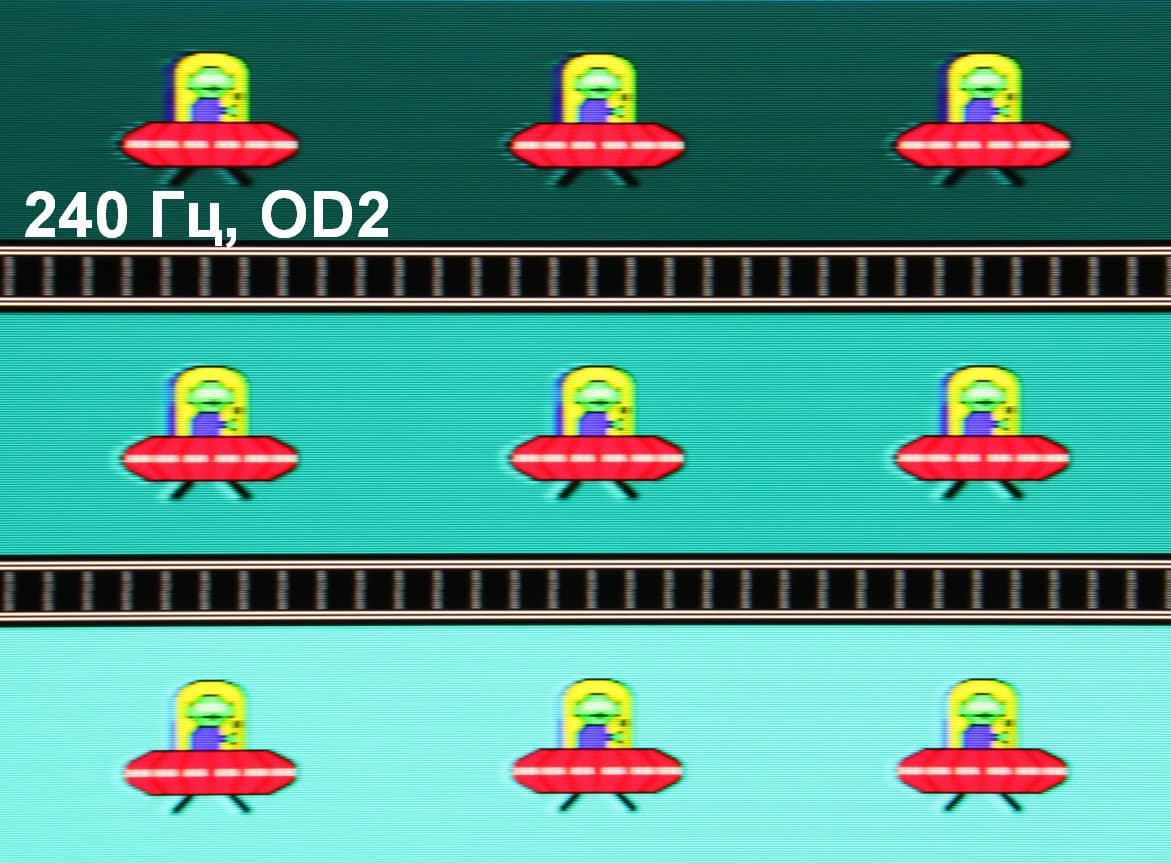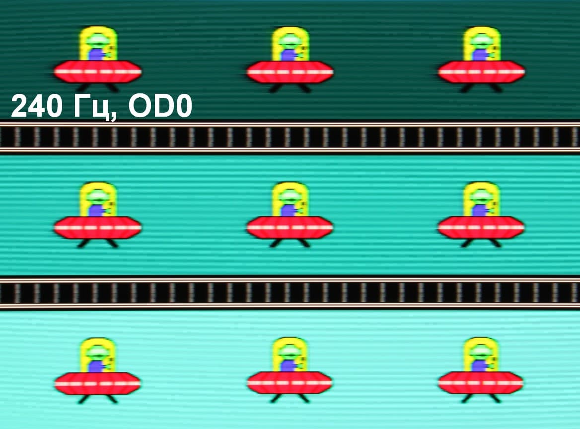 Для наглядного представления о том, что на практике означает такая скорость матрицы, какие могут быть артефакты от разгона, приведем серию снимков, полученных с помощью движущейся камеры. Такие снимки показывают, что видит человек, если он следит глазами за двигающимся на экране объектом. Описание теста приведено тут, страница с самим тестом тут. Использовались рекомендованные установки (скорость движения 960 пиксель/с для частот обновления 60, 120 и 240 Гц), выдержка 1/15 с, на фотографиях указаны значения частоты обновления, а также ступень разгона (ODx; x = от 0 до 3).