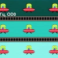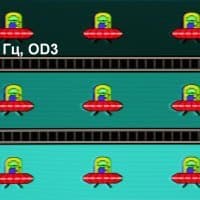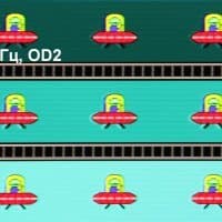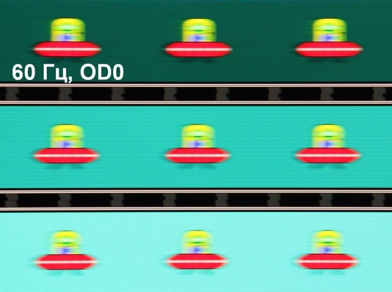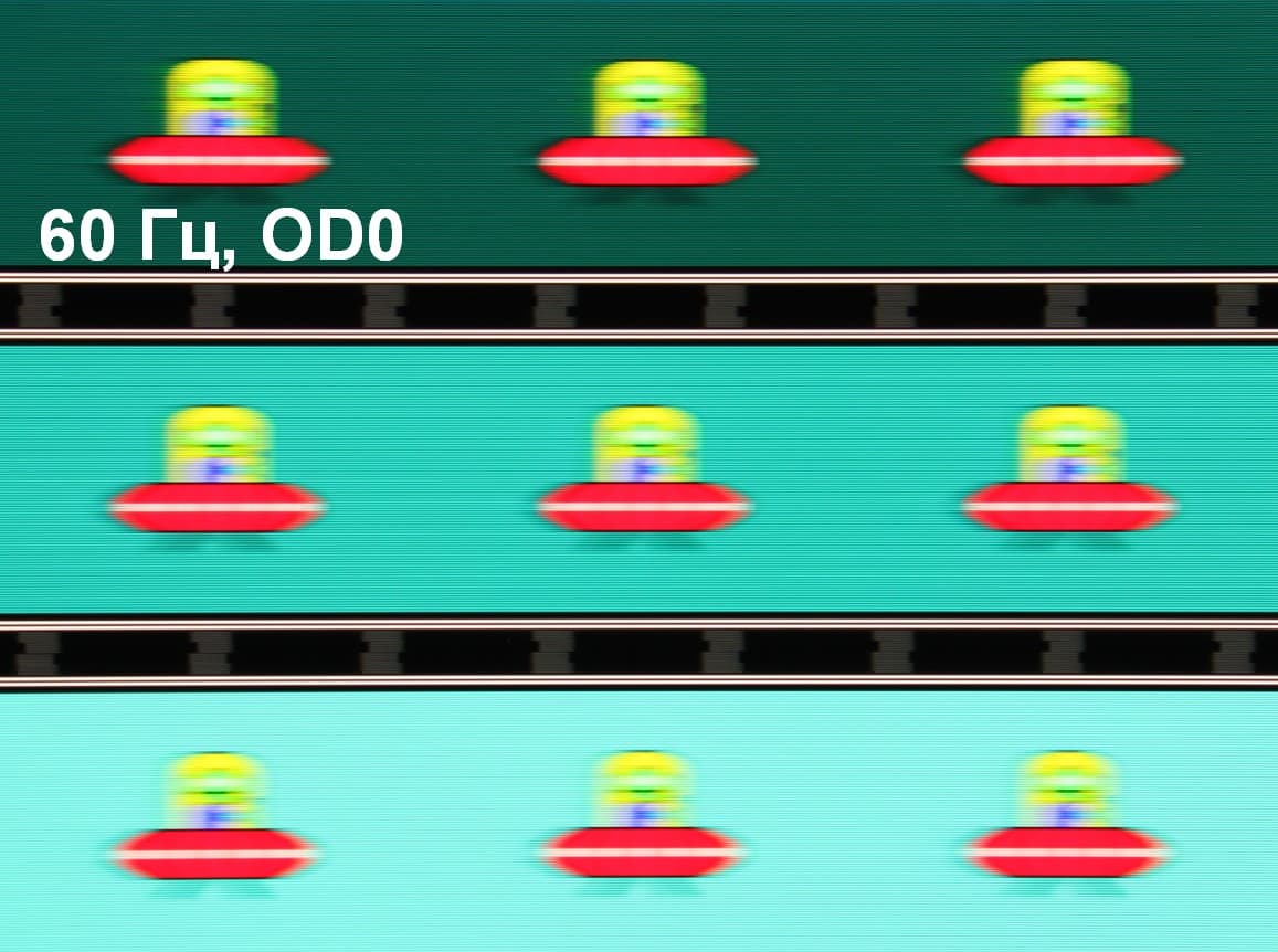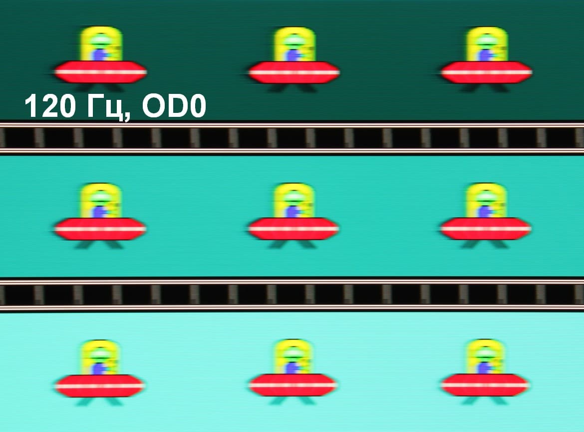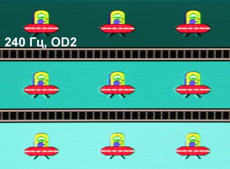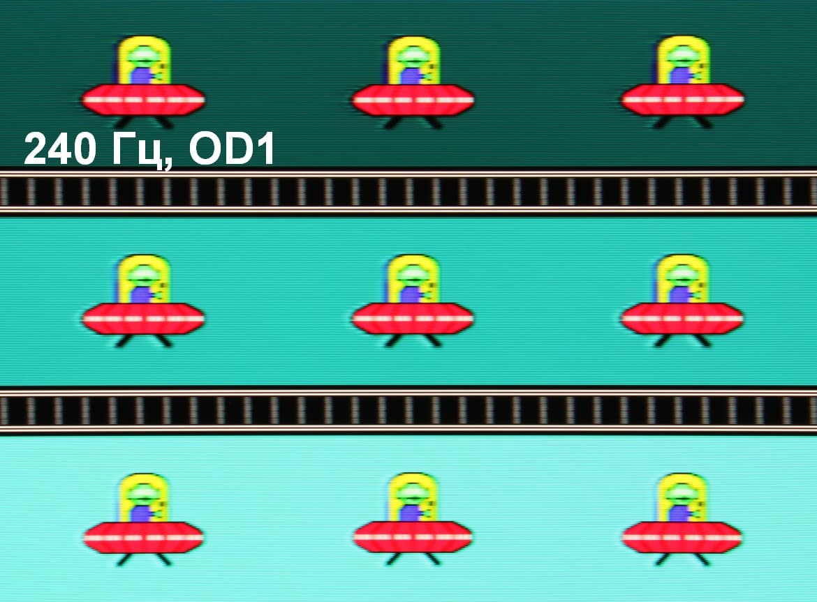Для наглядного представления о том, что на практике означает такая скорость матрицы, какие могут быть артефакты от разгона, приведем серию снимков, полученных с помощью движущейся камеры. Такие снимки показывают, что видит человек, если он следит глазами за двигающимся на экране объектом. Описание теста приведено тут, страница с самим тестом тут. Использовались рекомендованные установки (скорость движения 960 пиксель/с для частот обновления 60, 120 и 240 Гц), выдержка 1/15 с, на фотографиях указаны значения частоты обновления, а также ступень разгона (ODx; x = от 0 до 3).