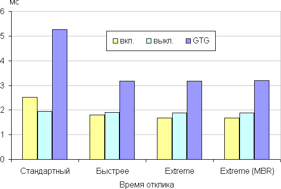 Время отклика зависит от значения одноименной настройки, которая управляет разгоном матрицы. График ниже показывает, как меняется время включения и выключения при переходе черный-белый-черный (столбики «вкл.» и «выкл.»), а также среднее суммарное время для переходов между полутонами (столбики GTG) в случае режима с частотой обновления 240 Гц: