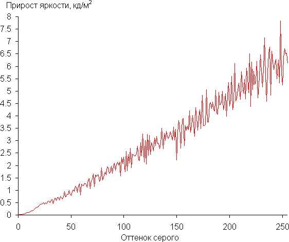 Реальная гамма-кривая ближе всего к стандартной при выборе варианта Гамма = 0, поэтому далее мы измерили яркость 256 оттенков серого (от 0, 0, 0 до 255, 255, 255) при этом значении. График ниже показывает прирост (не абсолютное значение!) яркости между соседними полутонами: