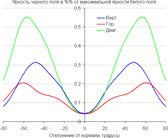 Чтобы выяснить, как меняется яркость экрана при отклонении от перпендикуляра к экрану, мы провели серию измерений яркости черного, белого и оттенков серого в центре экрана в широком диапазоне углов, отклоняя ось датчика в вертикальном, горизонтальном и диагональном (из угла в угол для формата 16:9) направлениях.