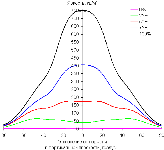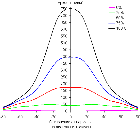 Из графиков следует, что при взгляде под углом хотя бы белый и основные цвета меняются несильно, но полутона (особенно светло-синий) существенно изменяются, что ожидаемо для матрицы типа *VA и является ее основным недостатком.