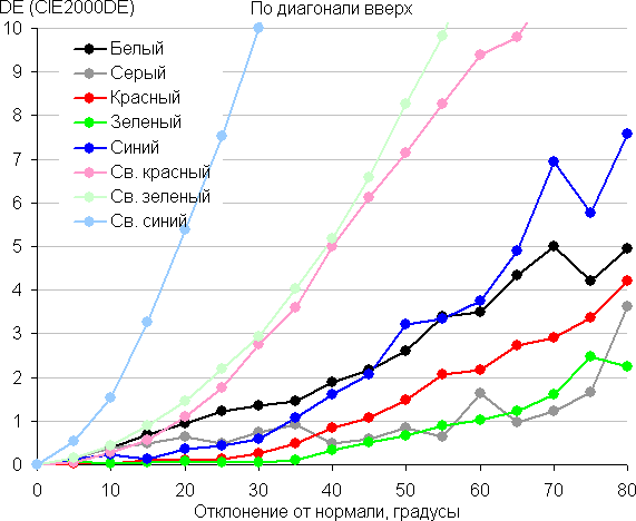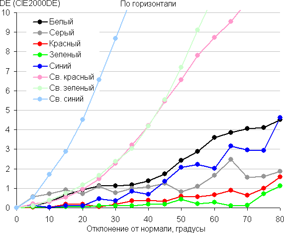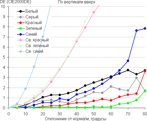 Для количественной характеристики изменения цветопередачи мы провели колориметрические измерения для белого, серого (127, 127, 127), красного, зеленого и синего, а также светло-красного, светло-зеленого и светло-синего полей во весь экран с использованием установки, подобной той, что применялась в предыдущем тесте. Измерения проводились в диапазоне углов от 0° (датчик направлен перпендикулярно к экрану) до 80° с шагом в 5°. Полученные значения интенсивностей были пересчитаны в ΔE относительно замера каждого поля при перпендикулярном положении датчика относительно экрана. Результаты представлены ниже: