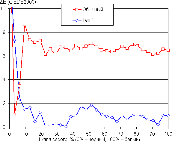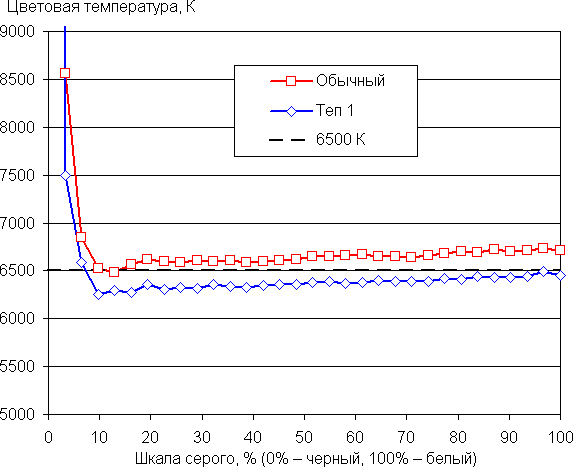 Цветовой баланс просто при выборе профиля Обычный для настройки Оттенок, который обеспечивает максимальную яркость и контрастность с сохранением приемлемого качества изображения, хороший, так как цветовая температура близка к стандартным 6500 К и отклонение от спектра абсолютно черного тела (ΔE) ниже 10 единиц, что для потребительского устройства считается приемлемым показателем. При этом цветовая температура и ΔE мало изменяются от оттенка к оттенку — это положительно сказывается на визуальной оценке цветового баланса. При выборе профиля Теп 1 максимальная яркость немного снижается, но цветовой баланс лучше — ΔE ниже 2 единиц, что просто отлично! Графики ниже показывают цветовую температуру на различных участках шкалы серого и ΔE в случае этих двух профилей: