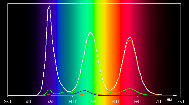 Ниже приведен спектр для белого поля (белая линия), наложенный на спектры красного, зеленого и синего полей (линии соответствующих цветов), когда в явном виде нет корректировки цветового охвата